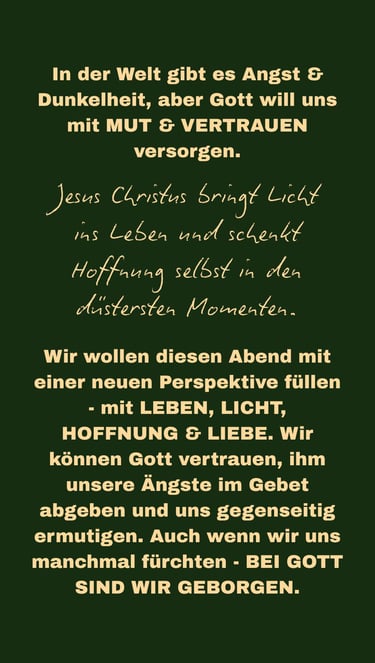 Wir treffen uns regelmäßig auf der Wiese hinter dem Gemeindehaus, wo wir miteinander Abenteuer erleben, Freundschaften pflegen und neues Wissen über Gott & die Welt lernen. Mit Jesus an unserer Seite entdecken wir gemeinsam die Natur, die anderen Menschen und uns selbst.